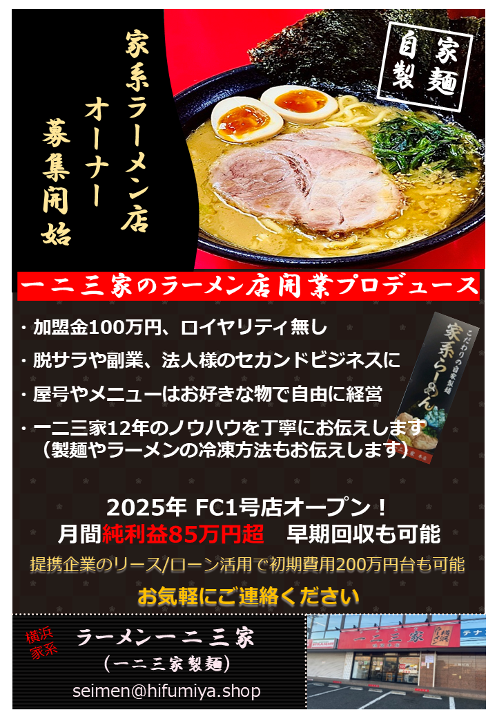 脱サラや副業、法人様のセカンドビジネスや業態変更等で家系ラーメン店を開業したい方を支援致します。